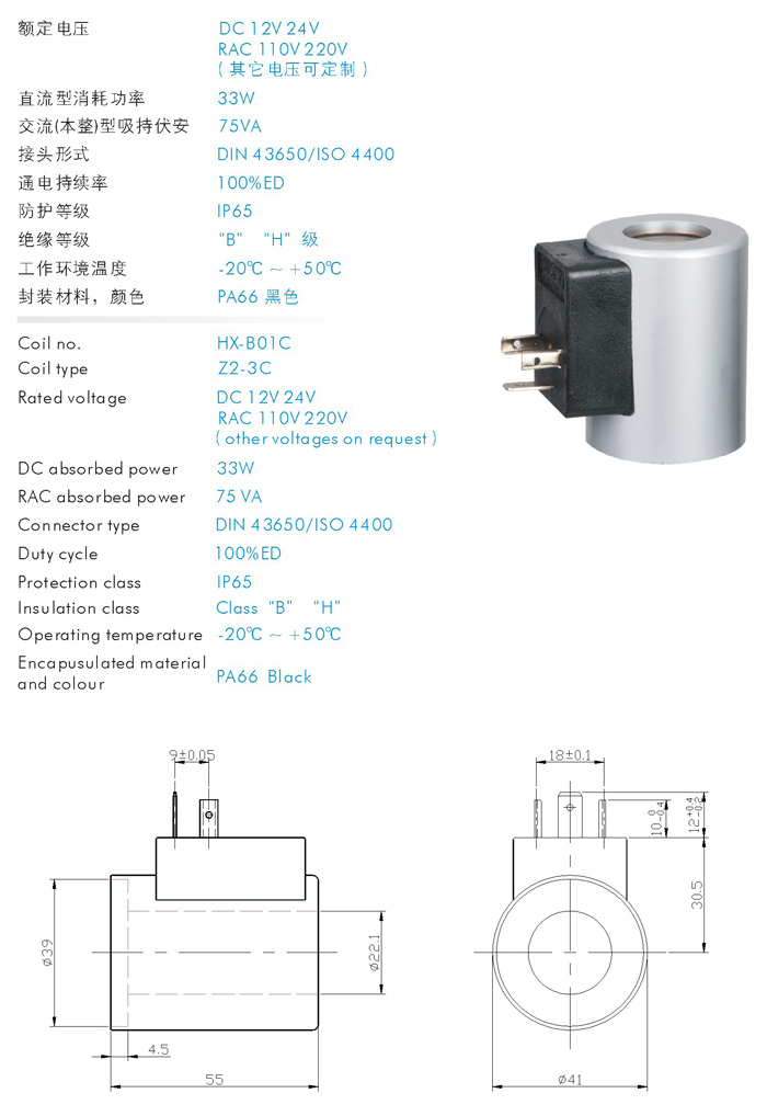 Z2-3C 电磁铁线圈, DC12V 24V, RAC110V 220V, 防护等级IP65 ,接头形式:DIN43650 ,工作温度:-20℃~+50℃